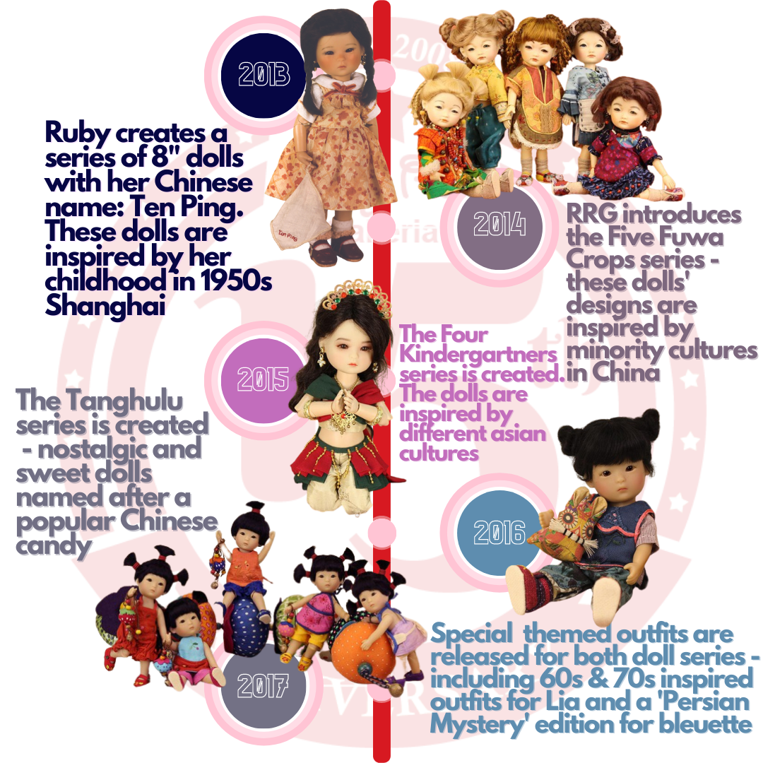 Ten Ping was one of the first doll series launched by Ruby and the team. The dolls function both as beautiful pieces of art and as physical manifestations of Ruby’s storied history. Ten Ping’s design and story is directly inspired by Ruby’s childhood in the Shanghai of the 1950s, and companion dolls such as Gigi, Yu Ping and Shan mirror various friends and family. Other notable series created by Ruby Red Galleria include Lia, Four Kindergartners and Girls of the Orient, which have all become very popular amongst doll enthusiasts.